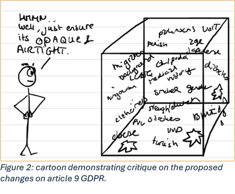One could argue that this space is needed to foster AI development in the EU. Nevertheless, I cannot help but wonder if special categories of personal data are necessary to boost innovation and competition – in all cases. In order to visualise this critique, and in a countermovement against generative AI taking over imaging, I drew a simple cartoon to demonstrate the essence of the commentary (see Figure 2).